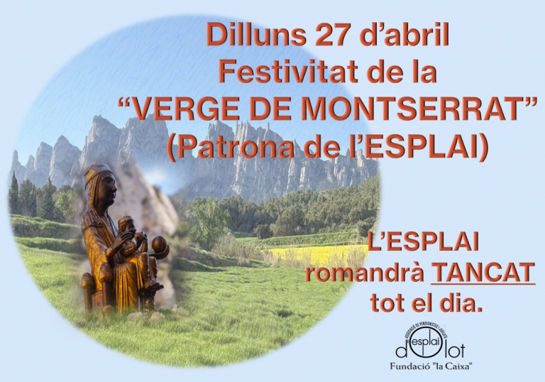 Dilluns 27 d’abril l’Esplai romandrà tancat per la festivitat de la Verge de Montserrat, Patrona de l’Esplai.