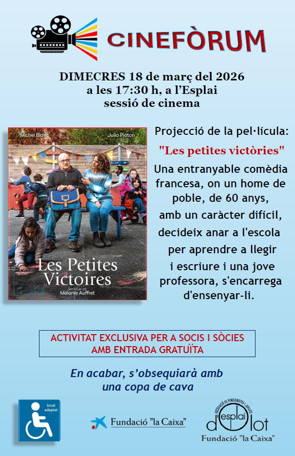 Cinefòrum Dimecres 18 de març – Cinefòrum a les 17:30 a l’Esplai. Projecció de la pel·lícula “Les petites victòries”