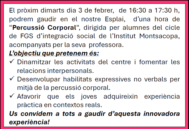 Dimarts 3 de febrer – Percussió corporal dirigida pels alumnes del FGS d’Integració Social de l’Institut Montsacopa acompanyats per la seva professora. – A l’Esplai de 16:30 a 17:30